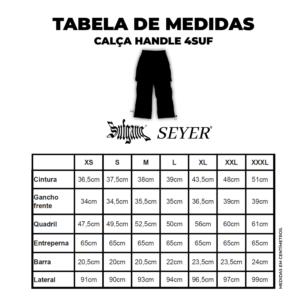 zíper selado, bordado “4SUF” na área do bolso, elásticos ao longo das pernas