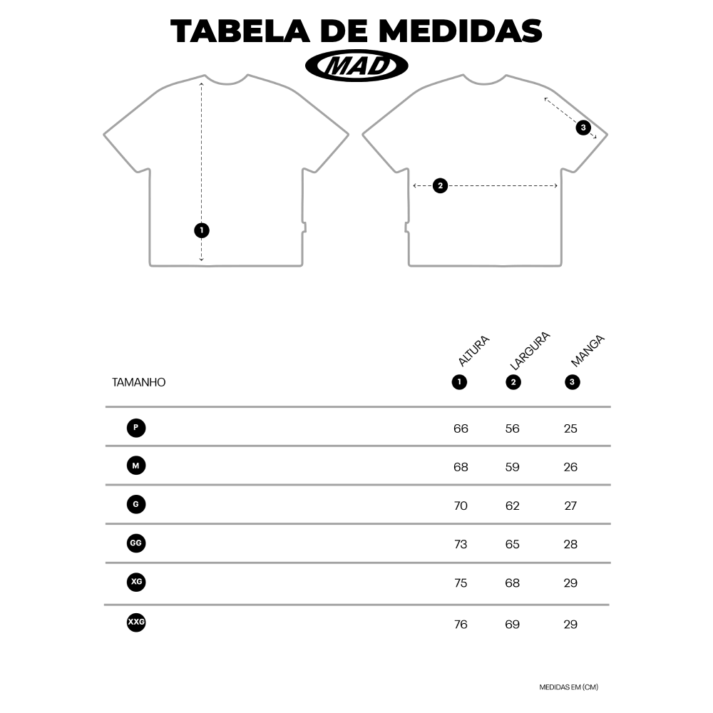 - Tabela de medidas em centímetros: